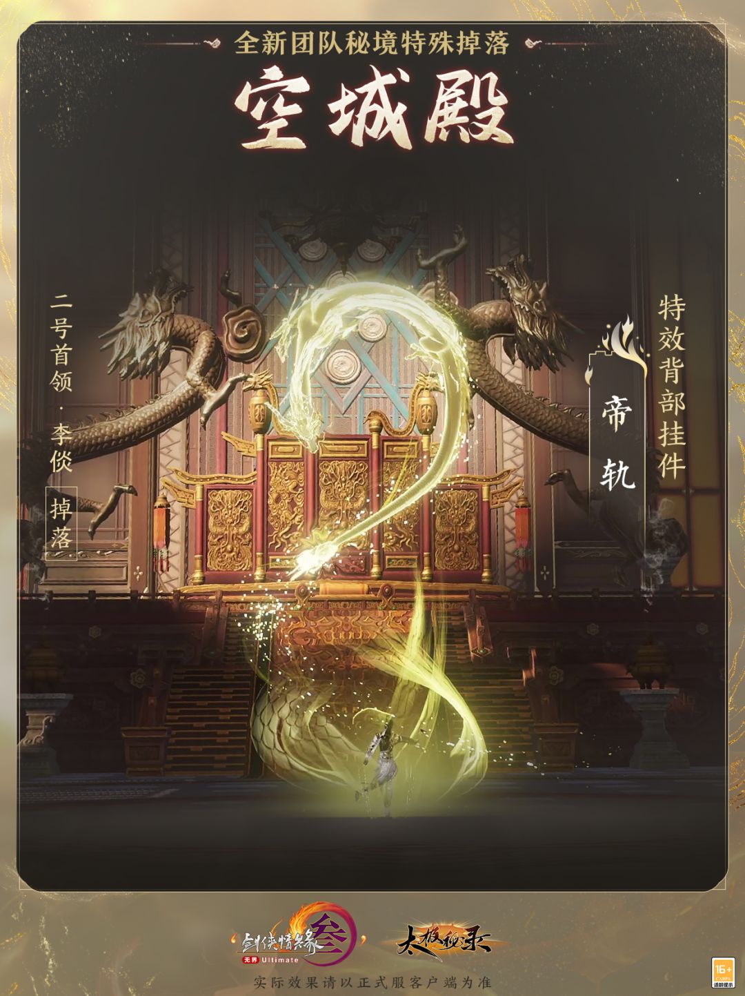 特效背部挂件“帝轨”以金色光效特殊龙纹装饰,流光熠熠,难掩霸气。开启特效后,将有专属镜头跟随动作运镜,侠士施展剑舞,金龙破地而出,盘旋环绕身侧。剑锋所指,势不可挡,凝聚钧天君之武学精髓,不可小觑!