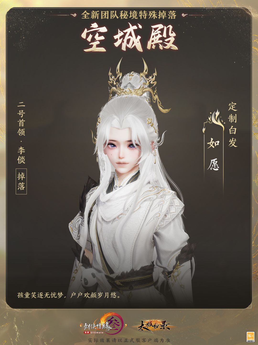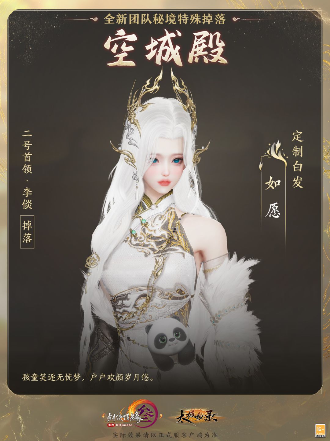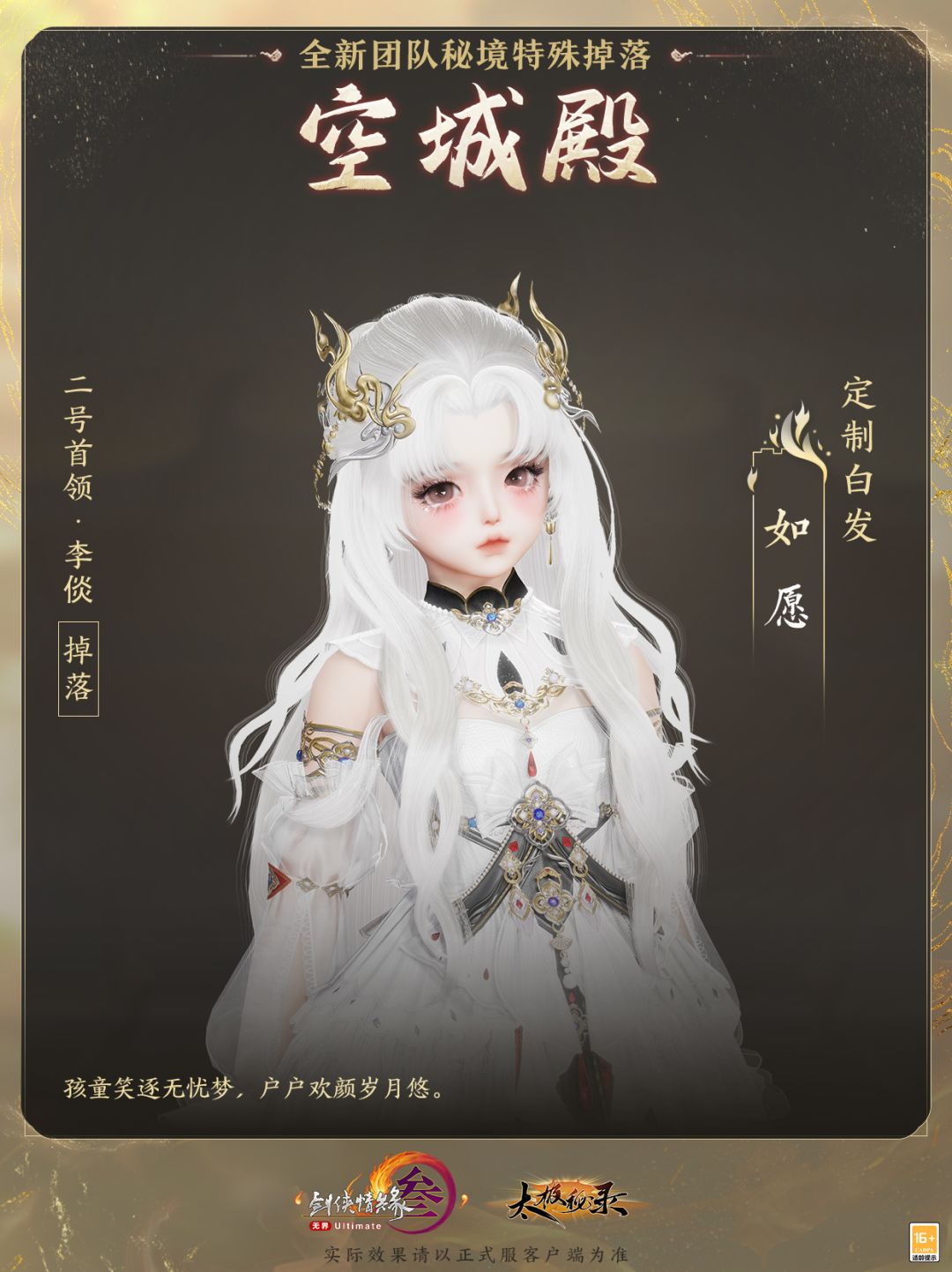 特效背部挂件“帝轨”桀骜不驯,定制白发“如愿”则更凸显优雅雍容!雪发如瀑垂于肩头,鎏金发饰缀于其间,似游龙欲飞,珠光宝气,华贵非常!