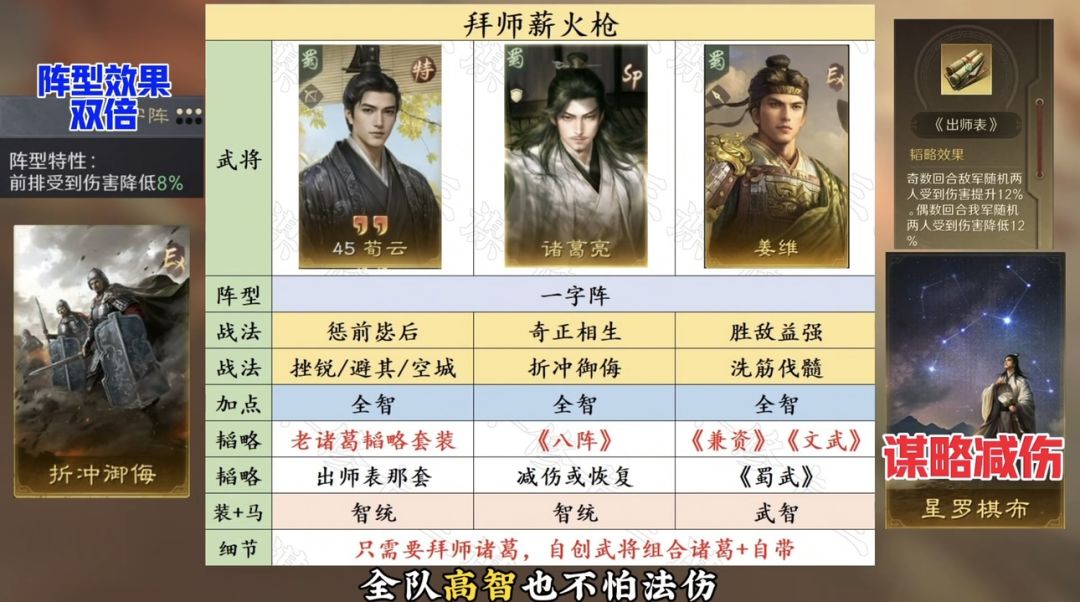 这套薪火枪解决了刘备会有频率不够的问题,自创武将是这队薪火枪的神来之笔,不仅能打满九伐还有不足的毒奶伤害,只用拜师诸葛就能建队,拜师诸葛可以继承老诸葛的草船借箭,还能传承诸葛的整套出师表韬略,并解锁薪火缘分和蜀国阵营,后续特性点够多可以带超级挫锐,自创武将每回合5次频率,惩前毖后2次+奇正2次+各自的平A总共有12次频率,除去首回合奇正不发动也能打满九伐,并且这队减伤非常多,一字阵双倍减伤+折冲+出师表+SP 诸葛谋略减伤,全队高智也不怕法伤。