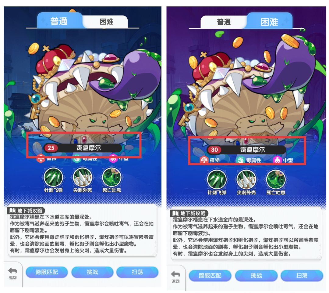 副本分为普通和困难模式,开放等级不一样,难度也不一样哦~如下图,普通模式BOSS为25级,困难模式下BOSS则为30级。