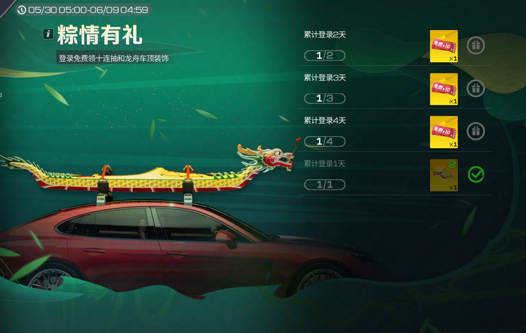即日起-6月9日,累计登录4天即可领取免费三十连和龙舟车顶装饰;还有神秘惊喜福利明日揭晓,据说可以低门槛得十连抽+传奇车辆?车手们千万别错过啦~