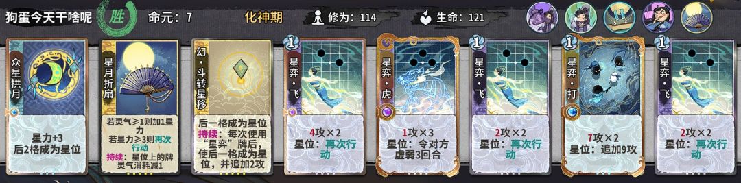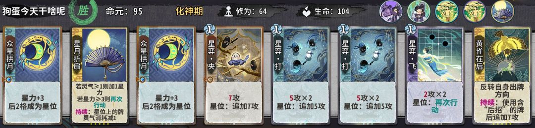 核心思路是用算无遗策或众星将四号位变成星位,消耗牌可放黄雀在后、大还丹、冰灵护体丹,化神后有两张众星或摸到天元/斗转后算无遗策就可以走了。