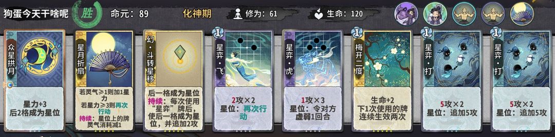 小技巧二:摸到的星弈牌还不多的时候梅开是一张好牌,举个例子,在这一轮中判断四、五动平铺两张打也无法击杀对面,梅开五动的打让伤害最大化。但如果判断对面有可能四动内会击杀你,就不要贪梅开打,让自身四动内伤害最大化减少损失的命元。