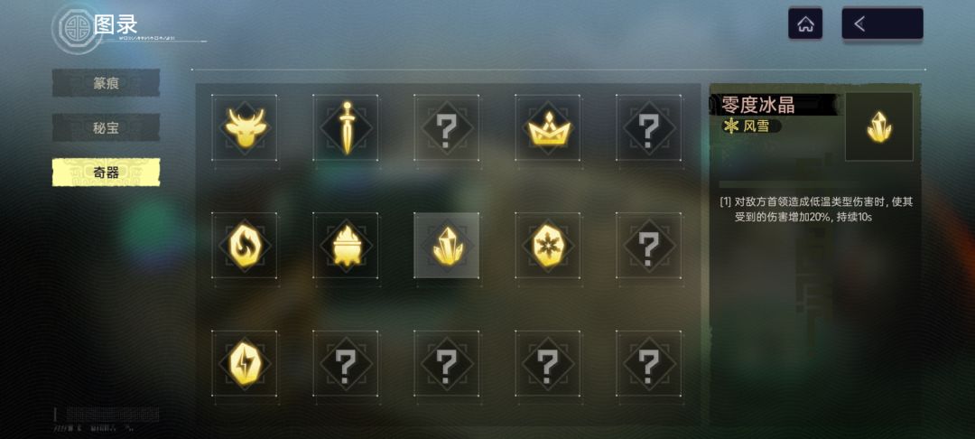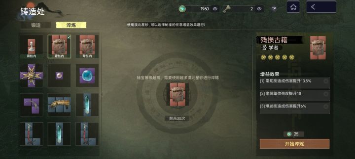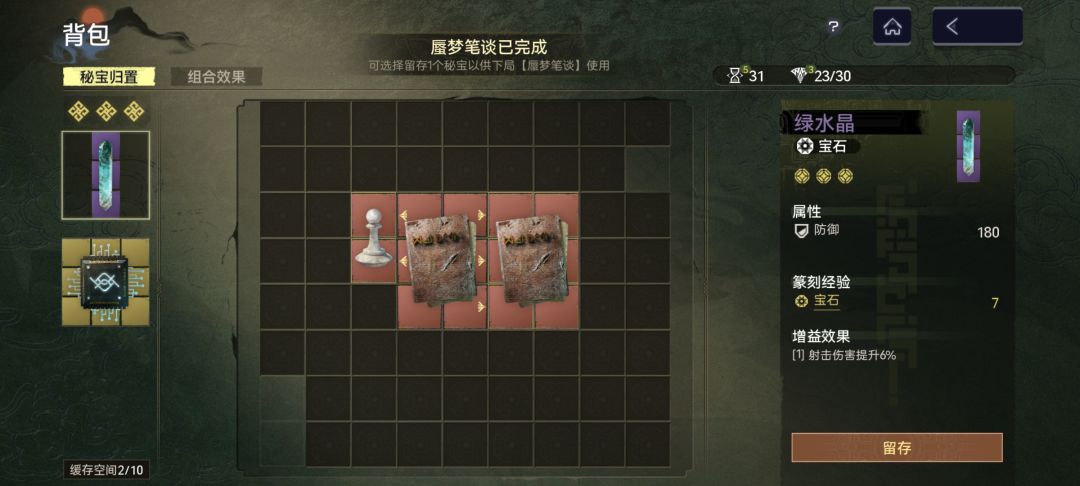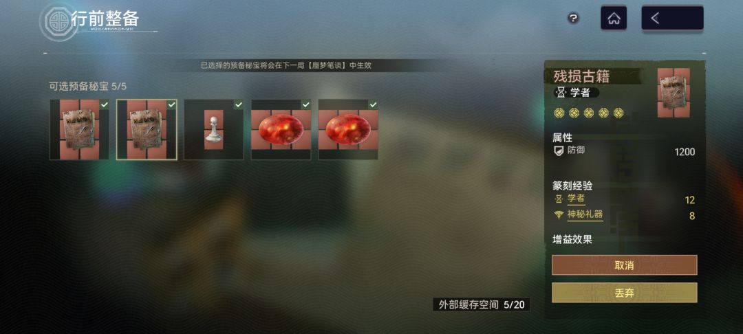 3.秘宝选择:残损古籍。第一把就盯着古籍合成,合出红色古籍后,可在⚖️商店的锻造处淬炼洗词条,一局结束,在留存界面把古籍打包,再开前进“行前整备”勾选古籍,进游戏带上,结束时可以留存你带进游戏的古籍,这样你就得到了2本完美词条的红书,图省事可以一直这么刷,不想这么放空也可以刷点白玉棋子(补位凑神秘礼器)和红宝石(风雪有冰冻硬控易伤)