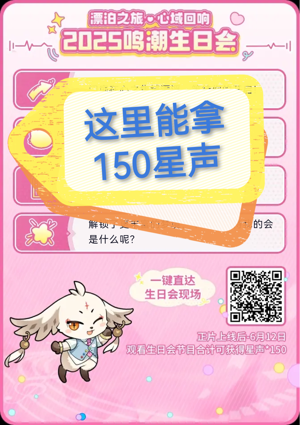 扫码或在小破站搜鸣潮生日会,看三组视频,每个≥1分钟,能拿150星。2.4前瞻发了6个薪角色,看看她们的人气