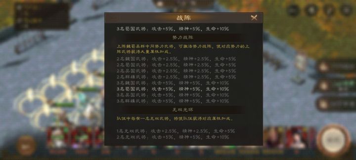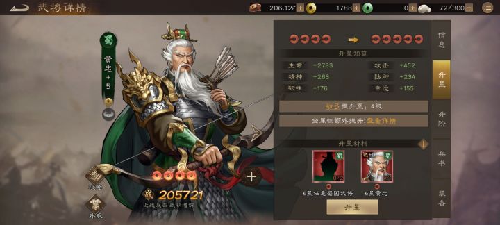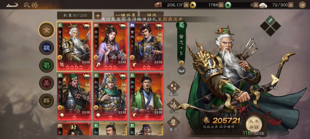 阵容方面前期有什么用什么,建议同势力武将不要超过3个不然很难培养,武将升星需要同势力的,上阵太多会抢合成资源。个人推荐一下黄忠感觉更强,本游戏二爷很强势,同势力会触发羁绊增加属性。