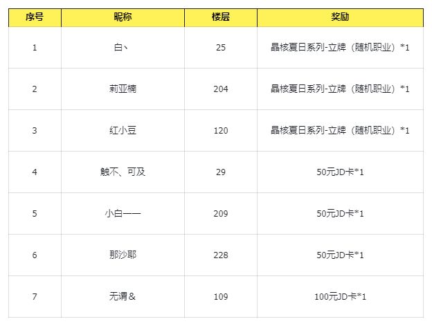 回复层数达到150层时,随机抽出1位冒险者,送出100元JD卡*1
