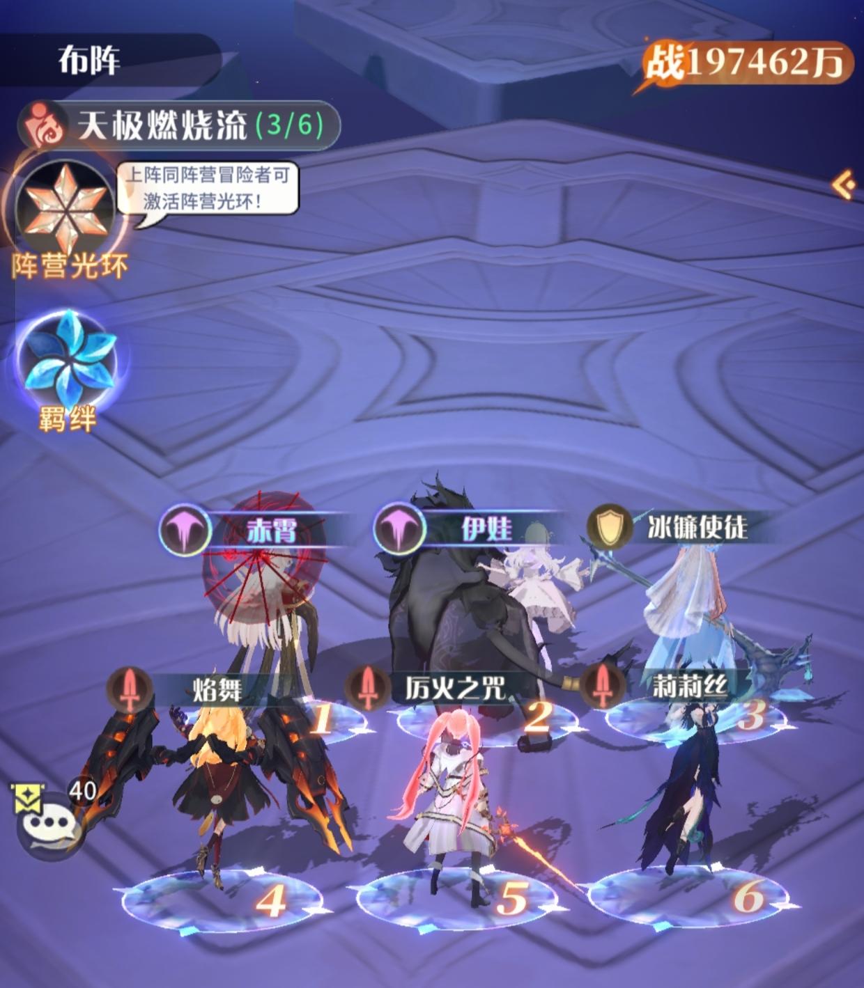 阵容以及硬件都放出来了,这套主要原理通过6元素羁绊的效果,造成持续伤害不停给队员加盾,增加坦度同时还给梦梦增加天极点,通过梦梦天极技打伤害,现版本环境太多控制,而且还有一堆削能量buff,只能通过焰舞被动和莉莉丝半神效果给对面叠火,靠着复活增加回合数,一边烧一边靠梦梦输出。