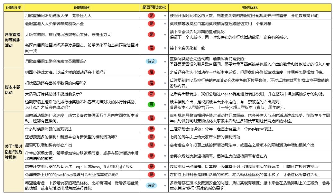 此次全方位的了解了大家的感受后,我们会尝试重新规划月歌直播间等限时活动的开启频率,也会关注大节点的活动游戏感受,争取在今年周年庆时做到同时兼顾优化大家版本活动过多和长草期过长两方面的体验。