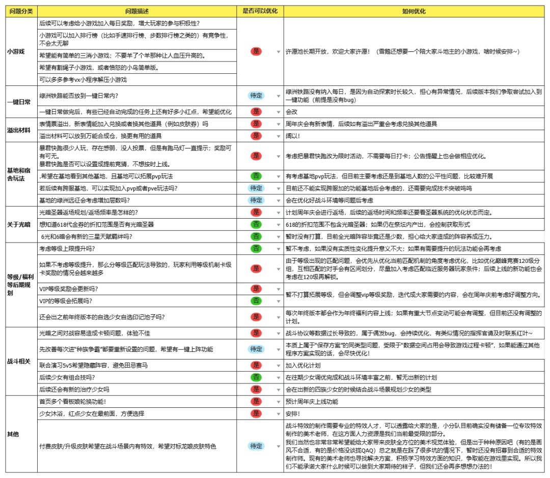 在“玩法功能主题”的总结中提到,后续有关玩法功能的优化和规划都会围绕着解决“丰富战斗环境”和“改善往期少女上阵空间”这两个核心问题展开。