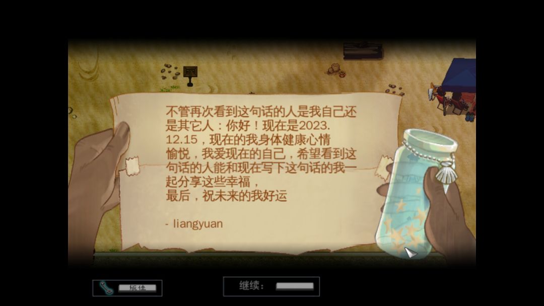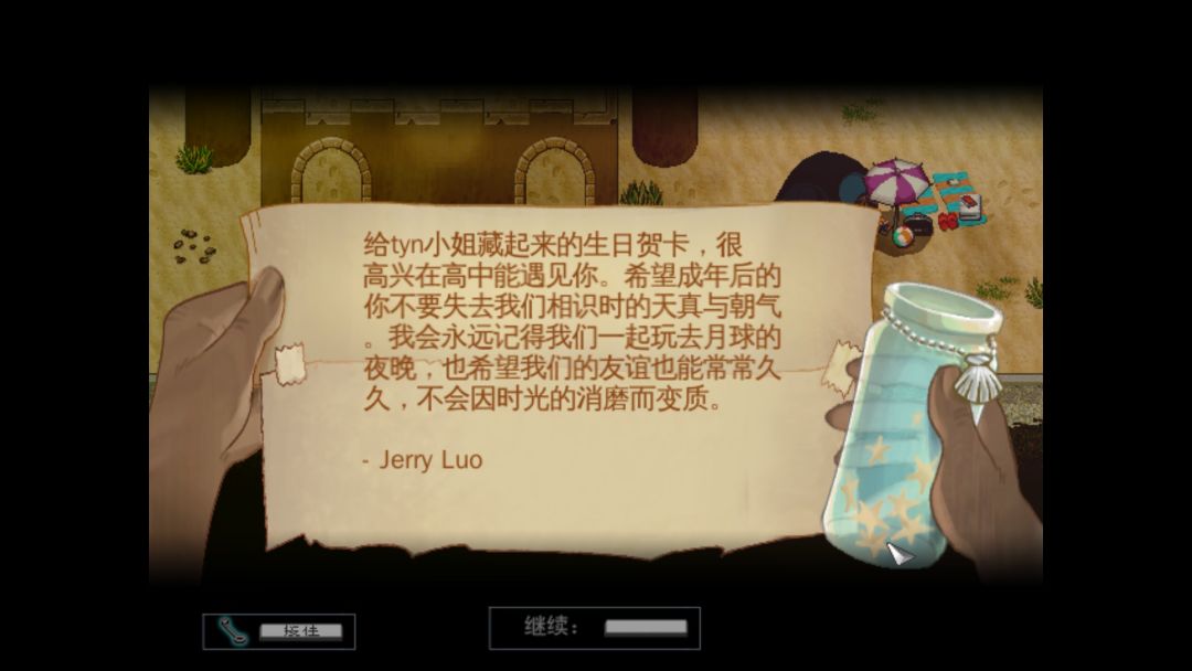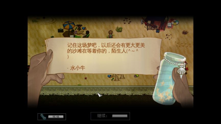 在游戏开始大概20分钟左右,玩家会获得一个叫做“海滩探测器”的道具。然后在游戏的沙滩场景进行探测,就会扫描到不同的漂流瓶,里面的内容不是游戏剧本本身的文案,而是游戏在众筹时期由每一位玩家留下来的想说的话。