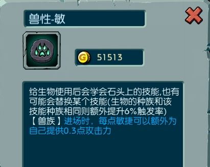 【兽性-敏】每点敏捷提升0.3攻击,进阶后为每点敏捷提升0.5攻击