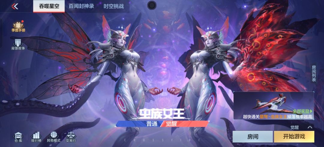 虫族女王作为吞噬星空挑战的最终BOSS,分为普通难度以及觉醒难度。越快通关猎弩-虫族女王掉落概率越高,获得次数达到上限后,仍可进行对局,但无奖励掉落。奖励获得次数将在每周一早上六点刷新。