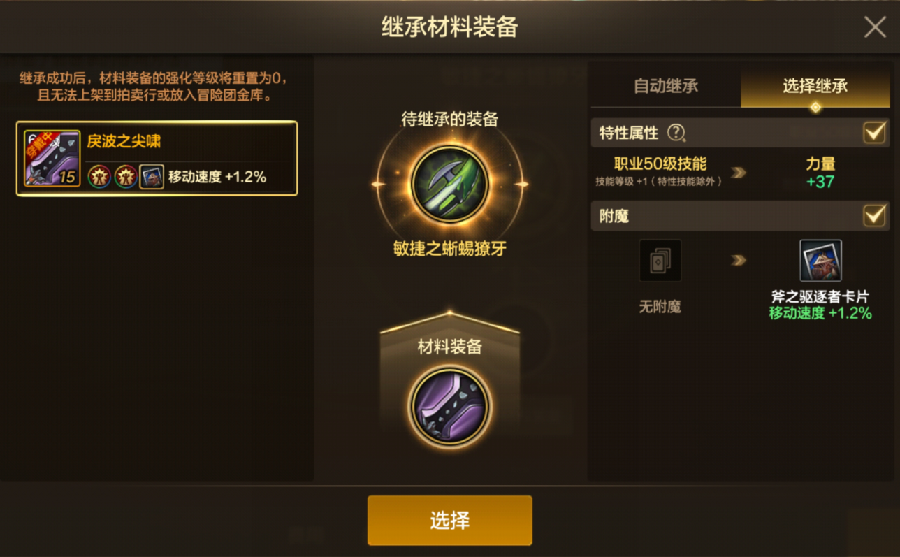 继承界面进行优化,分为自动继承和选择继承,自动继承则是强化相关数值,选择继承则是需要选择是否继承特性与附魔