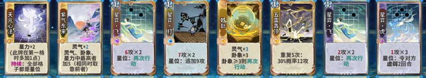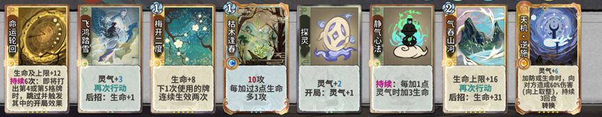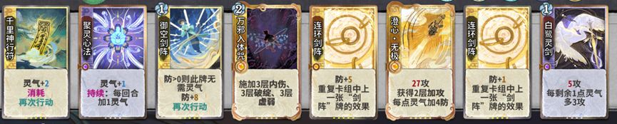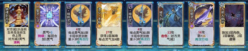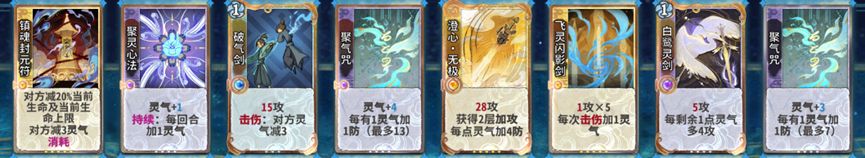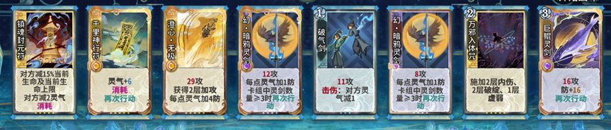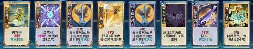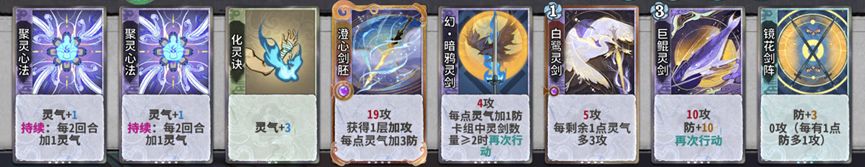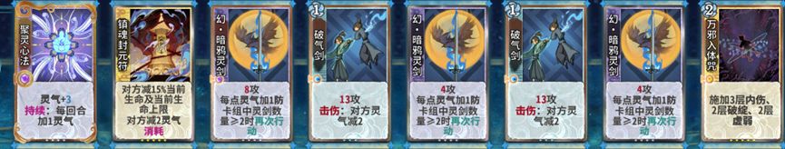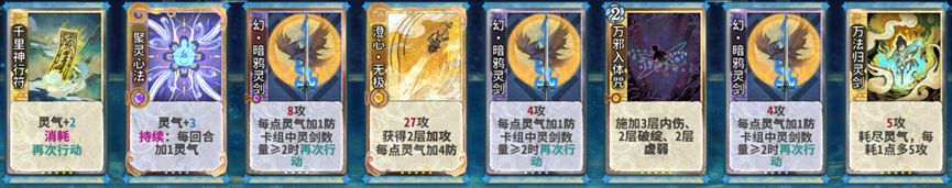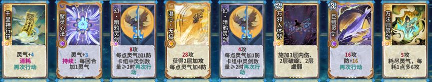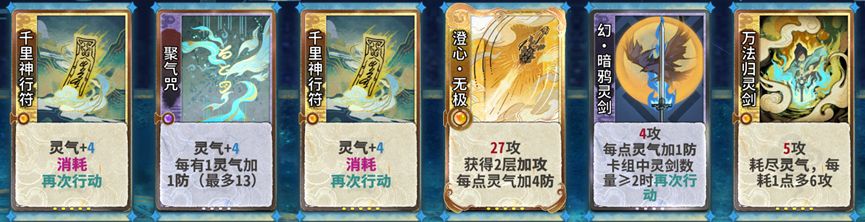 八轮空2牌上元婴大d:找消耗(聚灵,百鸟,吸灵符),蓝卡(一张即可最多两张)(聚气,化灵决,点星),再动(幻暗鸦,巨鲲,巨鹏),输出(白鹭,鲲镜花)稍微成型即可准备