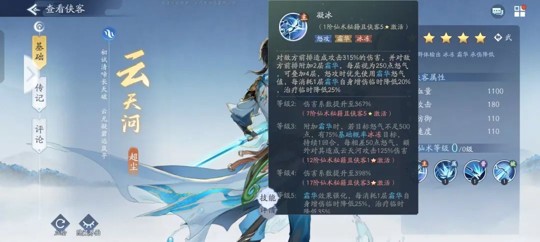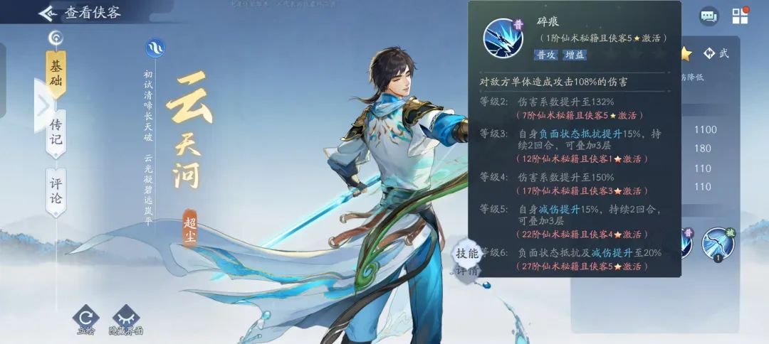 简易版:水云天河为武系侠客,速度为游戏最高速110速,属性加成为减伤和抗暴。