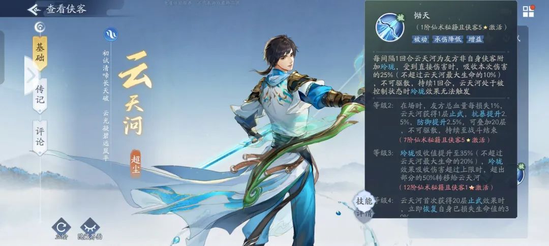 玲珑:受到直接伤害时,吸收35%伤害(最大不超过云天河最大生命值的20%),超出上限(云天河最大生命值的20%)时,超出50%转移给云天河,云天河收到的转移非暴击伤害降低15%,转移的暴击伤害降低25%。