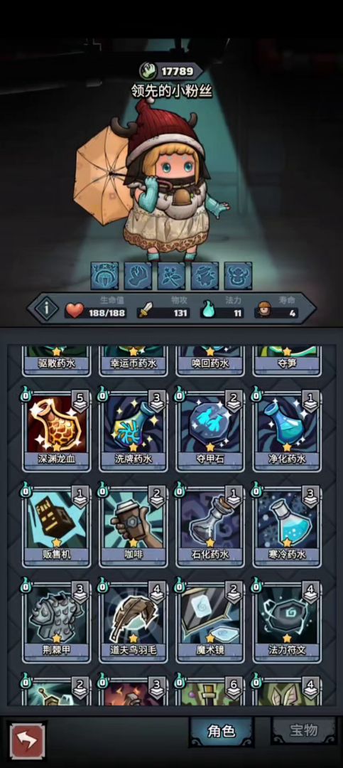旅行由于职业优势,升级给“和平鸽”,配合实验眼睛、巨人药水,几乎百分百可以直接胜利。实战视频中404即使跳关,背包也有2张“和平鸽”。不过为了演示正常打法,121/122还是选择了直接打。