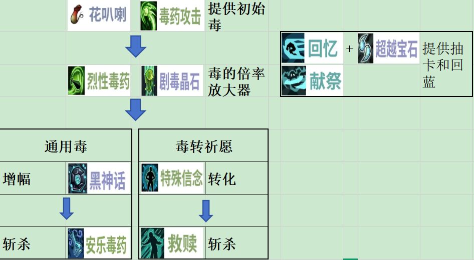 通用毒(毒转祈愿)基础核心卡就是“烈性毒药”,目的是通过“烈性毒药”快速叠毒印记,然后通过其它手段进行增幅后斩杀。 一般通用毒的斩杀卡是“安乐毒药”,毒转祈愿的斩杀卡是“救赎”。