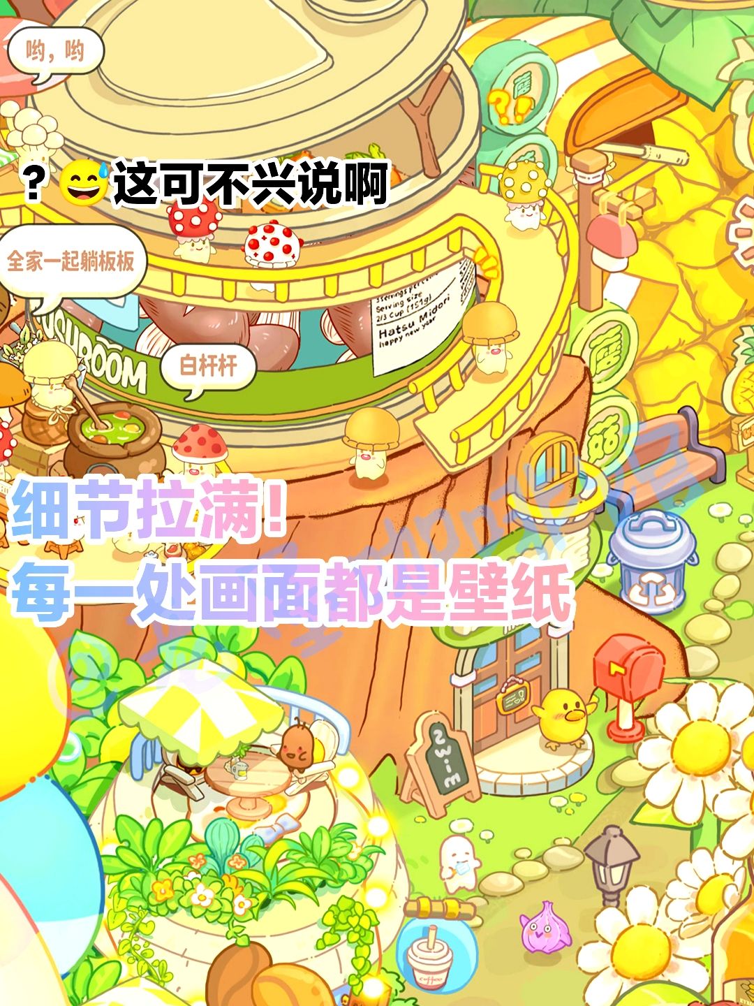 🍄菌子建筑,菌子游客……不过画风都很可爱!没有奇怪的东西出现(应该吧😅)