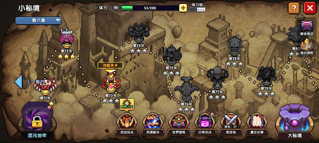 卡73关了,死活过不去。刷到了那个水系的祭坛也过不去被秒了