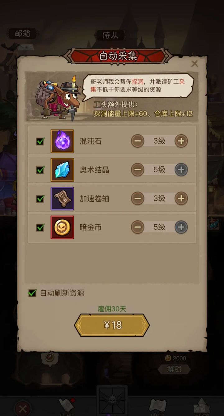 2.挖矿,这是第一天最重要的,不管怎么样都必须把挖矿开出来,然后开启自动挖矿,选择3级以上的加速券和混沌石,另外两个只要五级以上的。