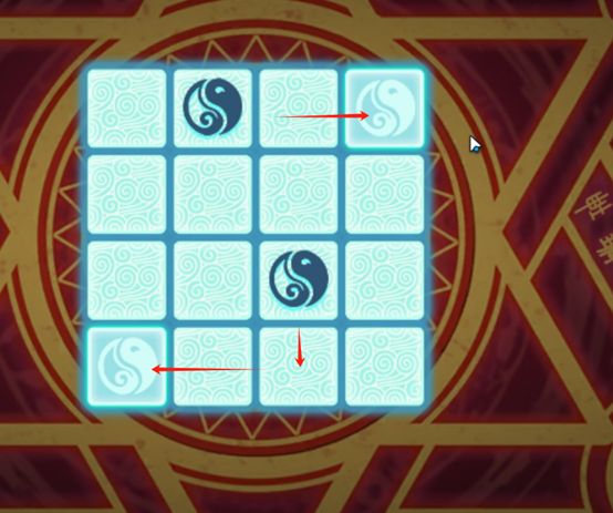我们一直往右走,出门之后会发现我们进入到了之前封印阵的内部,此时封印已经全部解除了。下方我们已经探索过了,所以我们继续往上走,走到分叉口之后我们发现前方的路被封印了,只能向右走。触发战斗,我们发现前后都是喽啰,所以我们直接攻击中间的本体即可,打死之后和机关进行交互,解法如下: