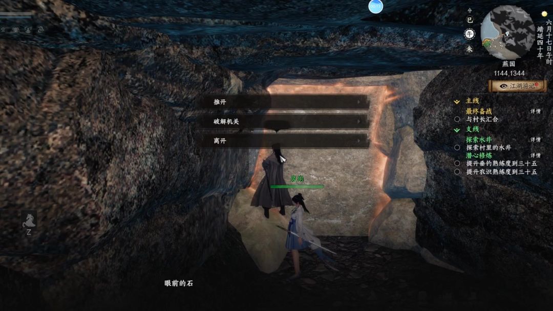 前往山谷深处→破坏石壁→打败绝影楼的人→与石壁互动→打开石壁开关
