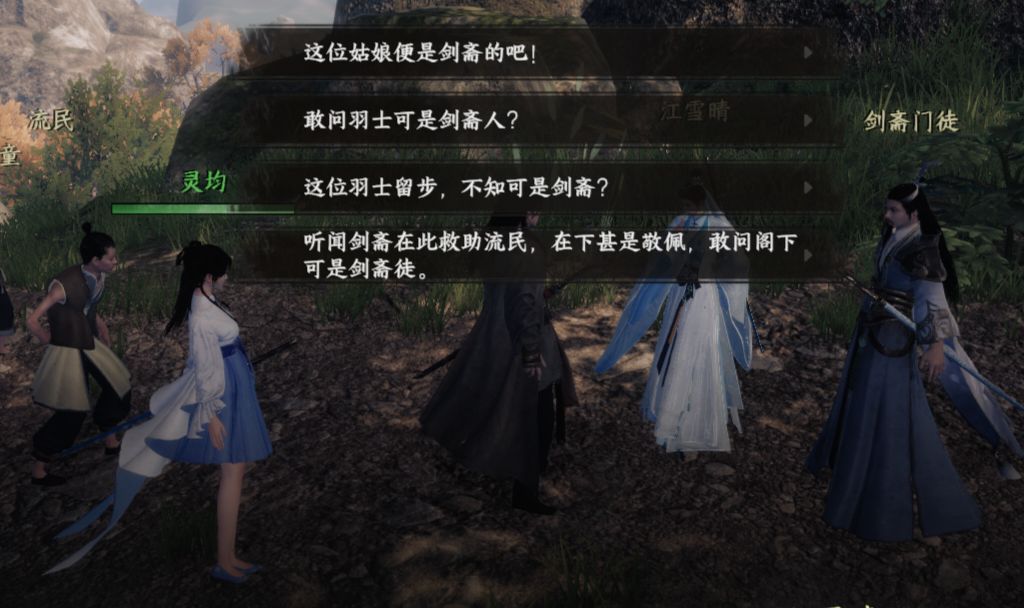 路上遇到劫匪击败过后,在旁边挑选马匹可获得坐骑→听三派弟子争吵→与三派弟子轮流交战[有队友灵均输出注意闪避伤害很容易打过,推荐将轻功里轻身功提升到化境,一秒一次身法闪避]