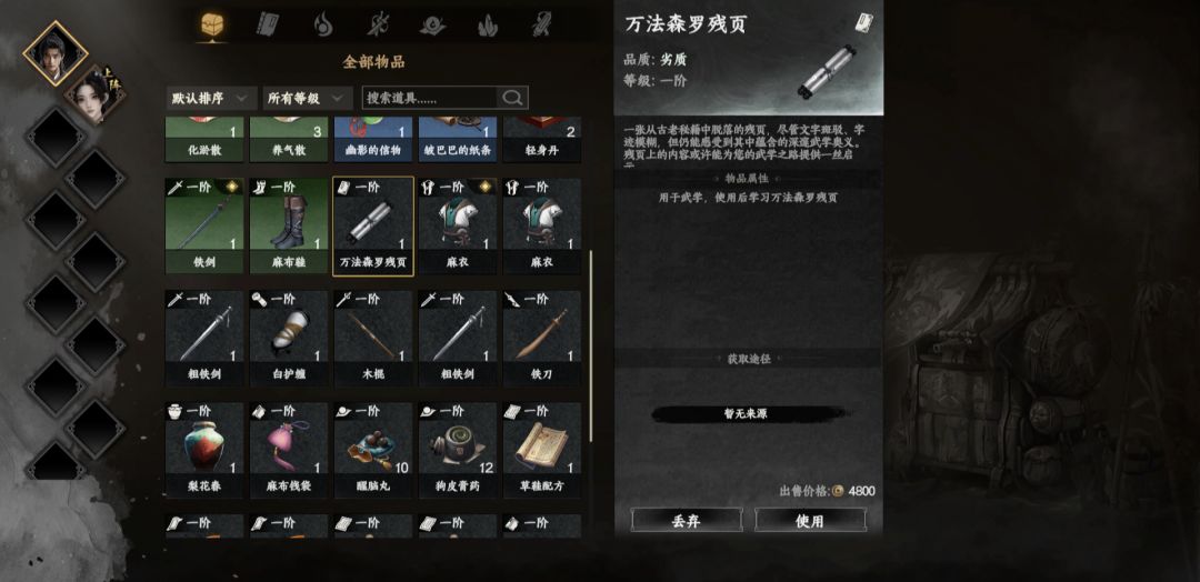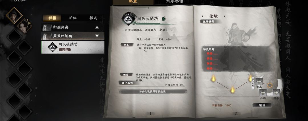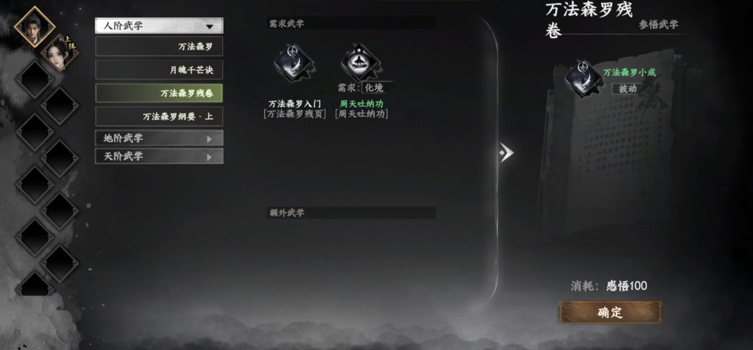 将武学里的周天吐纳功修炼到化境后背包使用万法森罗残页,即可在武学参悟,人阶武学→万法森罗残卷消耗感悟参悟