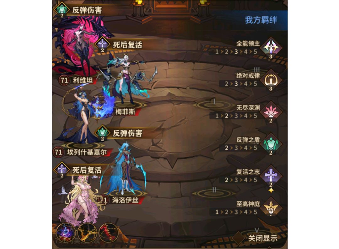 经过测试,我这边存活的回合数的确变多了,胜率能超过50%以上了,托尔先手嘲讽能吃掉对面大部分伤害,再配上神器混沌之刃的无敌盾,后排的存活率大大提高,而且除了无尽深渊羁绊外,7星美神和7星托尔又凑了个神庭羁绊(我方任意1人死亡,净化己方所有减益,清除敌方全体所有增益)。