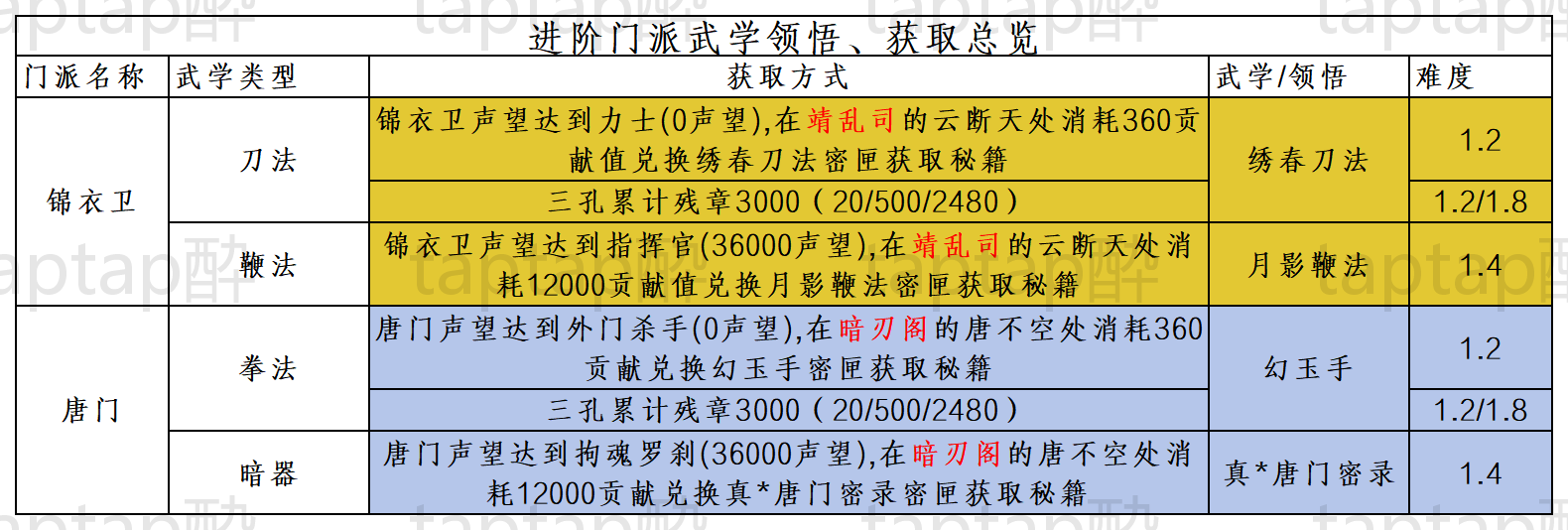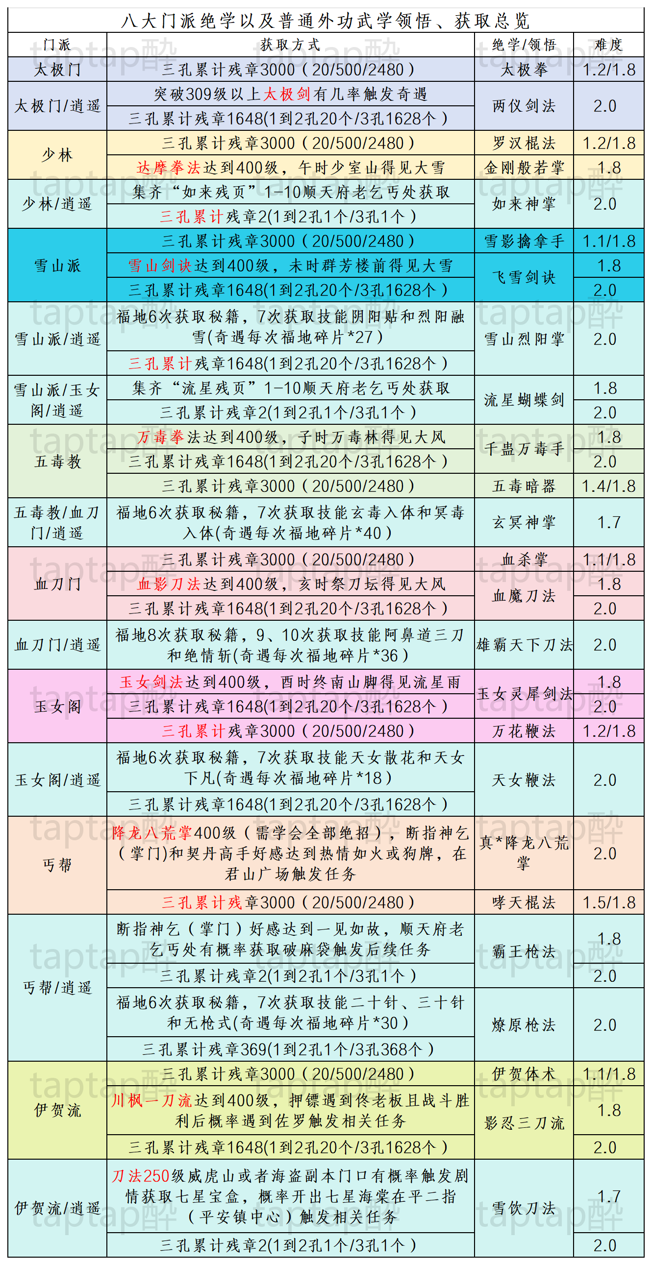 那么首要的就是了解一下各个门派能获取或者学习什么武学,这样是确定门派走向的第一步。