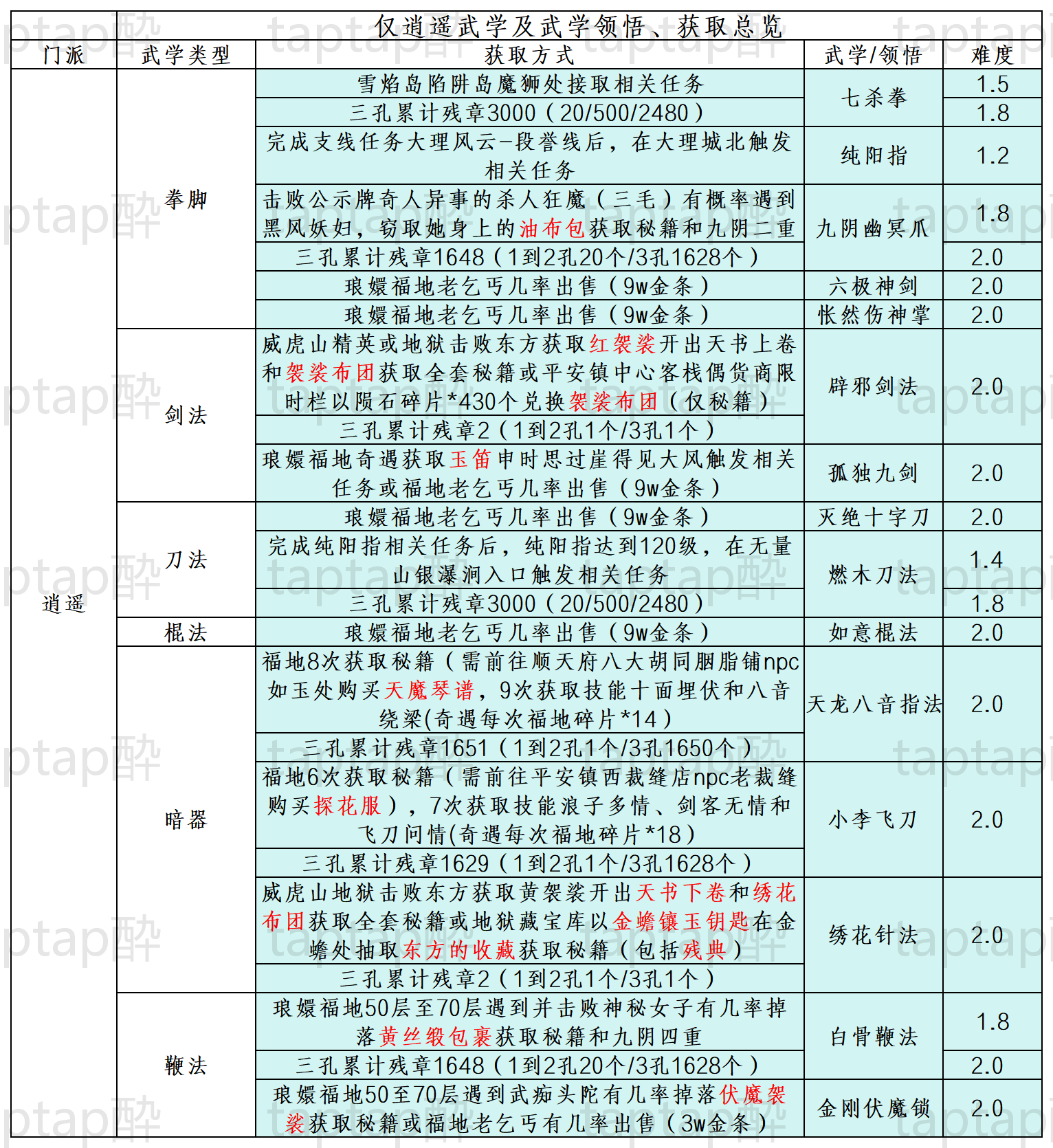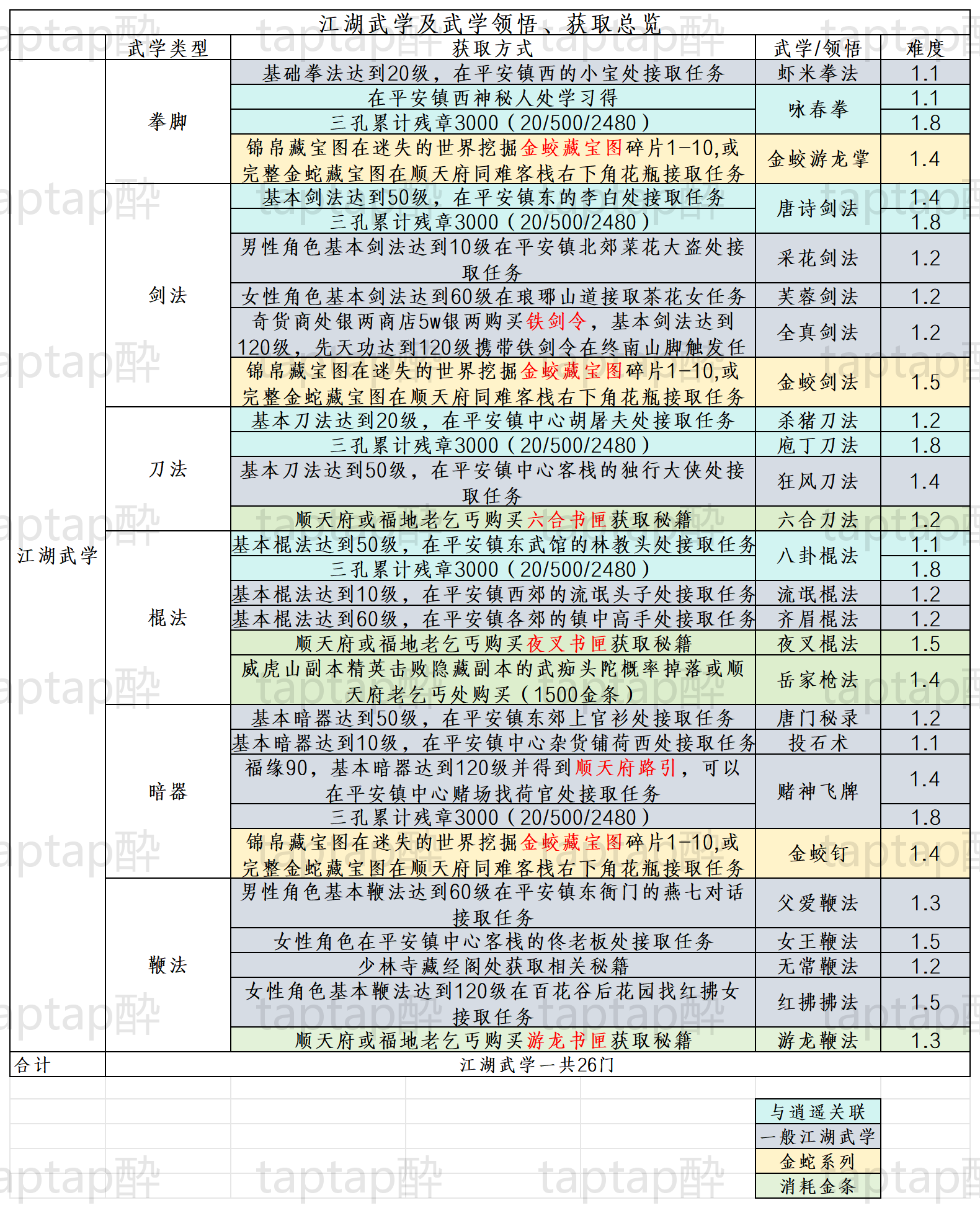 一个共26门大部分都可以算是轻易获取有些就需要一点运气,不过目前大部分玩家的真元需求量并不需要全部收集,所以没啥好担心小部分武学的缺漏。![[表情_开心]](https://img.tapimg.com/market/images/48516f625646b5ea2c66f0cab3c9c52a.png)