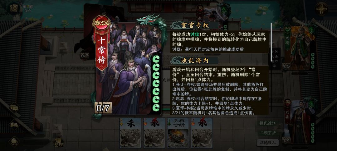 玩家打出一张牌时,十常侍摸一张相同的牌。十常侍有十二次仅受到一点伤害不会死的机会。