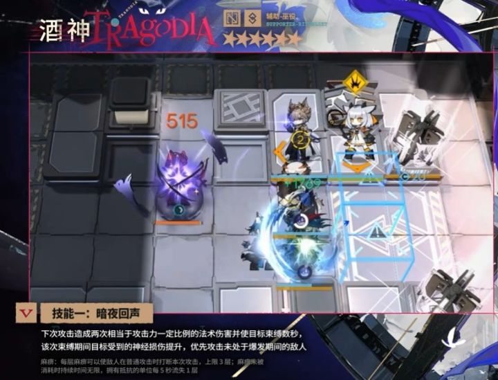 自动回复,手动触发,30秒。攻击范围扩大,攻击力提升,优先攻击未处于损伤爆发期间的敌人,技能期间酒神造成过神经损伤的敌人每秒受到攻击力一定比例的神经损伤直至爆发。范围内敌人神经损伤冷却恢复速度提升,神经损伤爆发时在其地面位置生成/刷新一个迷狂牢笼。