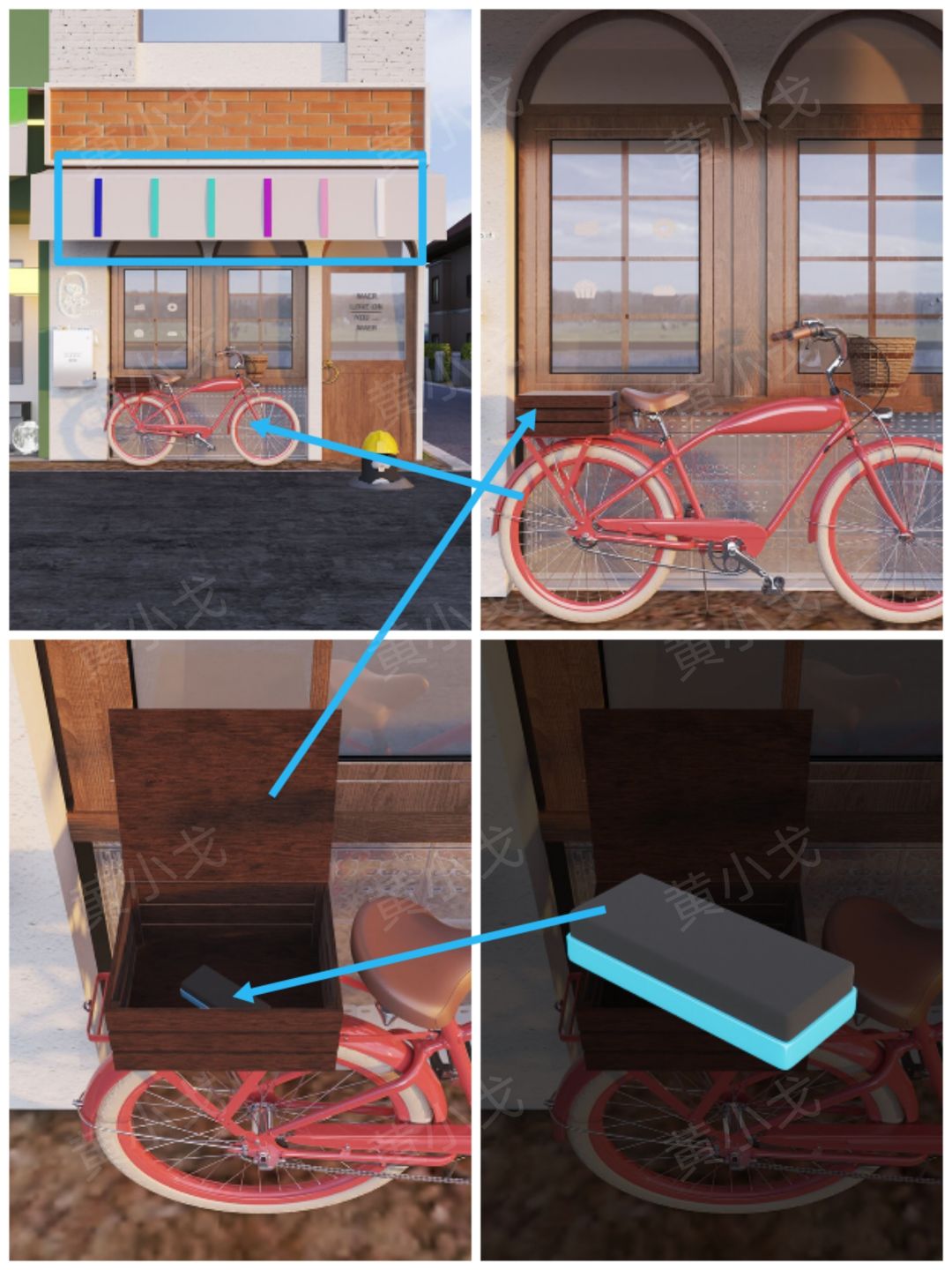 3.点击电箱上的密码锁,根据蛋糕店屋檐水滴形状大小线索,调整密码锁