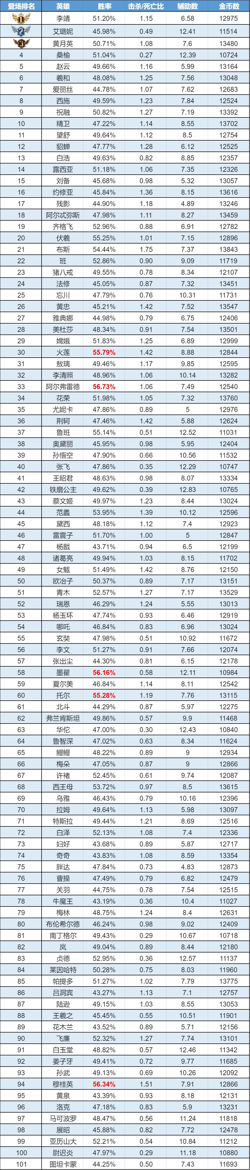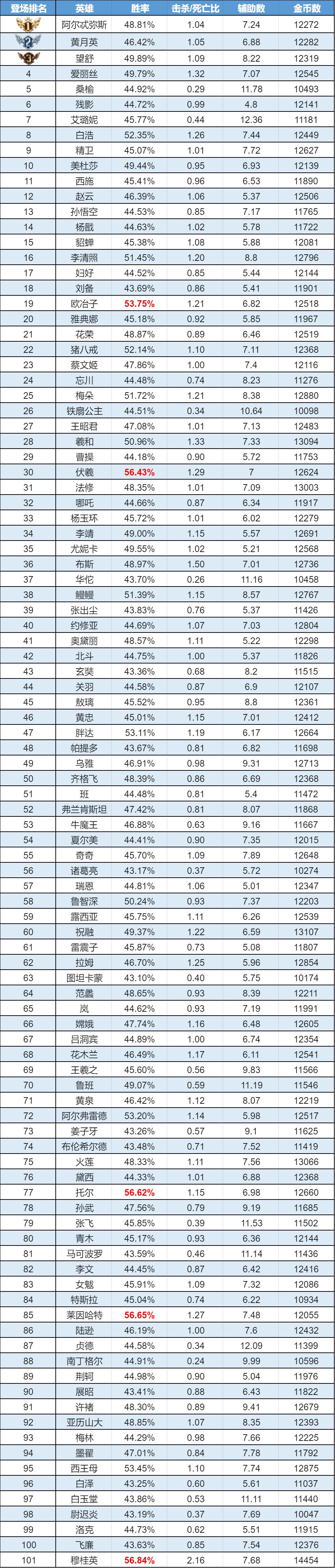 排序:按登场率高低排序,标红为胜率前5