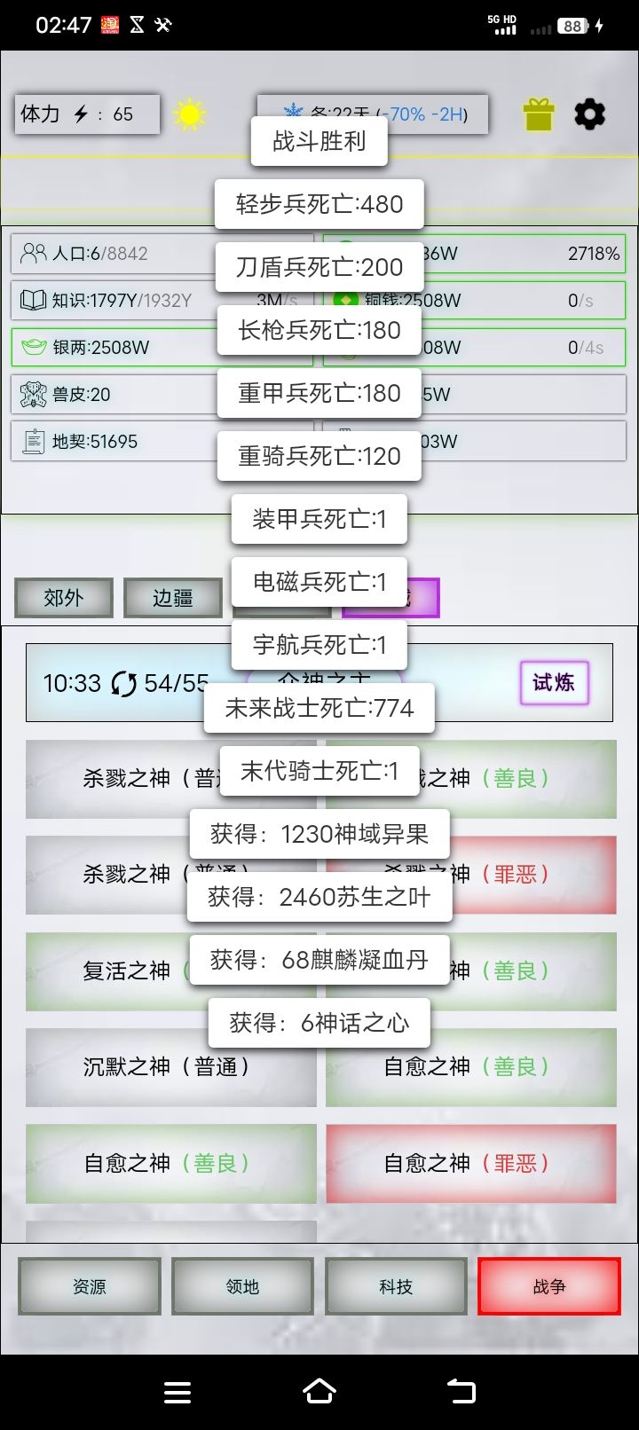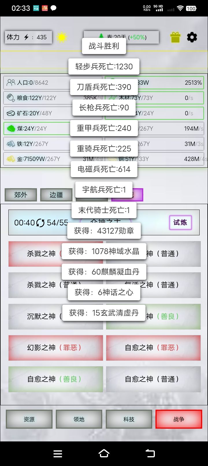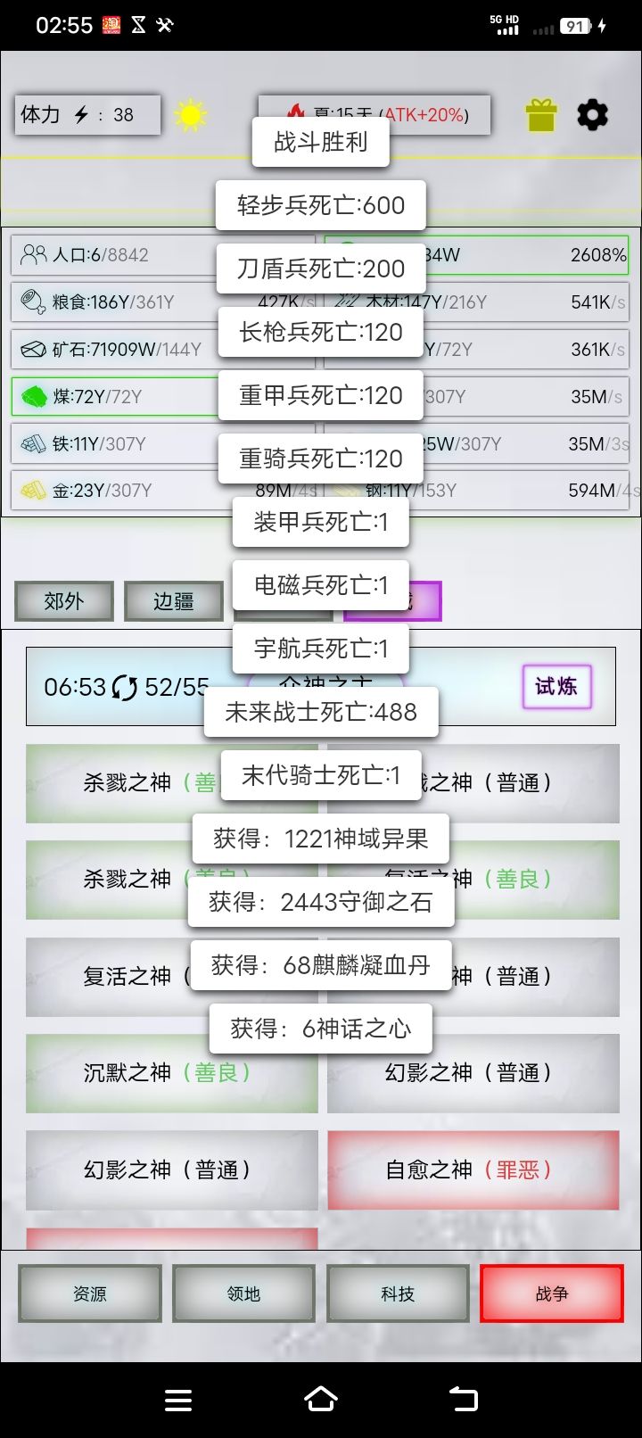 但是打到这个阶段后,杀戮和复活产出的材料都不算重要了,之前刷的已经够用。而神域异果后三神都有产出。所以培养了未来的话只需要对着守御和自愈投净化剂刷丹药就好。前几神每天打一两次把杀卡降的杀戮打上来就行。而且这个阶段要为进神话时代打大量的自愈之神,只有未来打红自愈效果最好。
