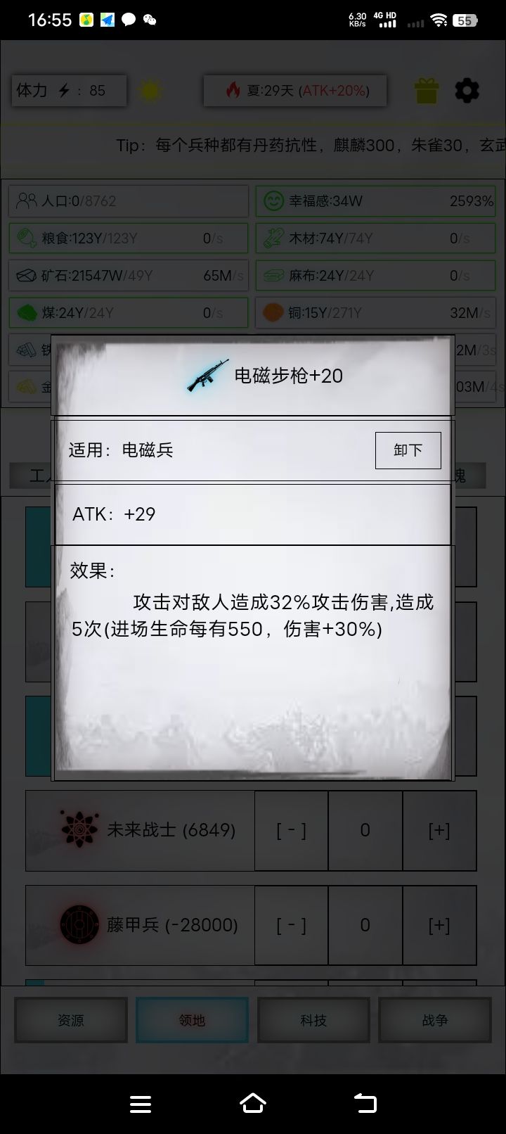 注意!步兵和重骑建议多上一些,步兵多上一百以上,重骑多上二三十。否则可能加攻加不满显著增加战损。