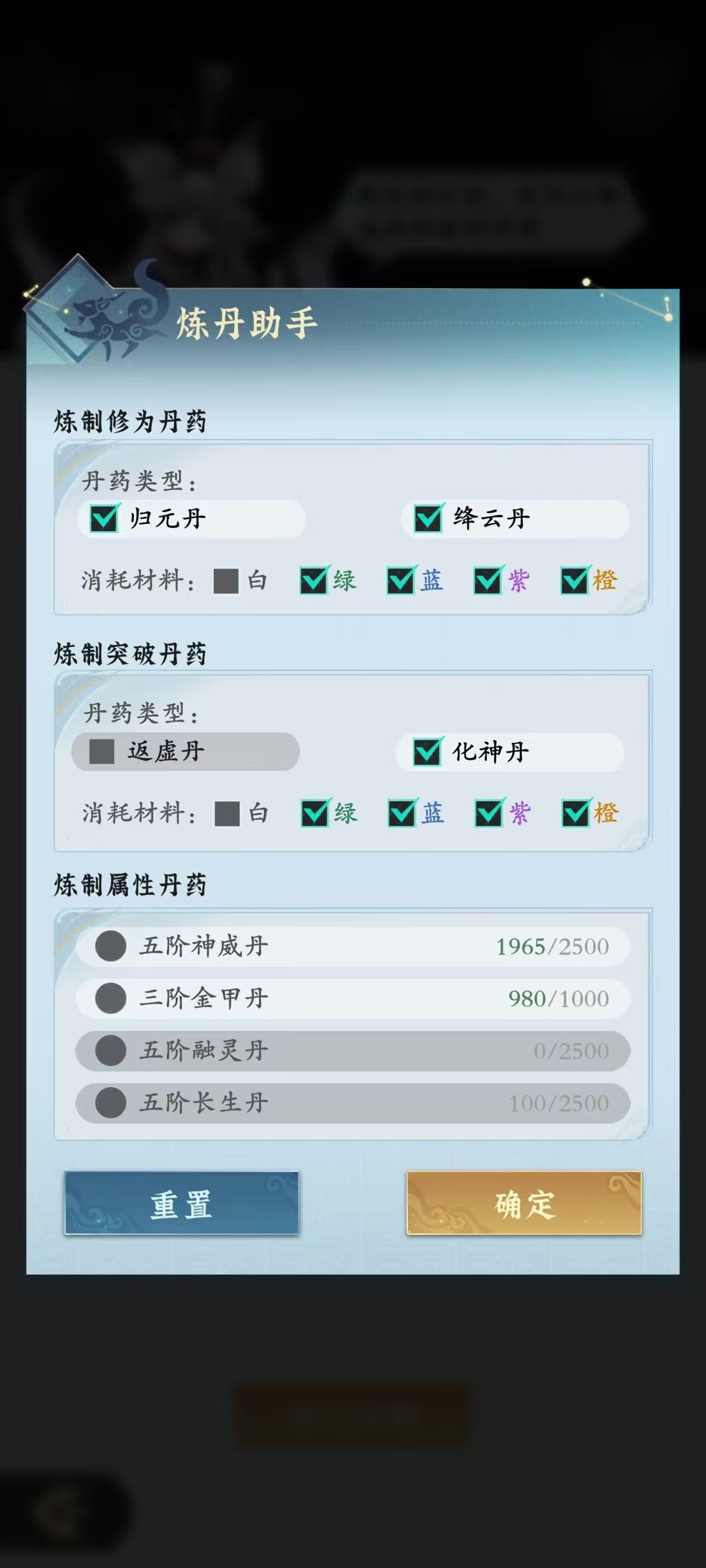 白色材料不勾选,因为世界地图开荒要用到。神威金甲等丹按需制作即可