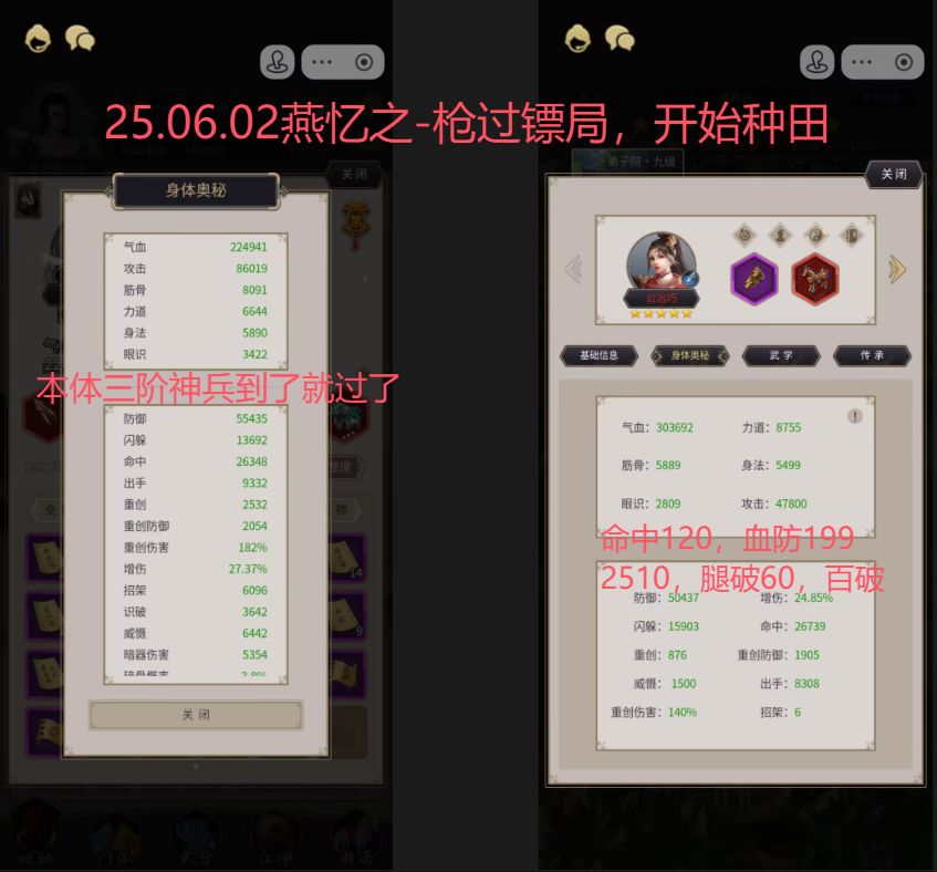 PS3:最好把镖局~种田合并计算为一个图,过了上官直接开始种田收益比较高。百花第一个腿怪重创很高,我重防调到2500还会被重创,也许是破防技能,5把才过。过了百花腿,6绝阵都是一次过,3钝器3人组拳差10%血没打过,不想赌了,沉淀1个月再说。