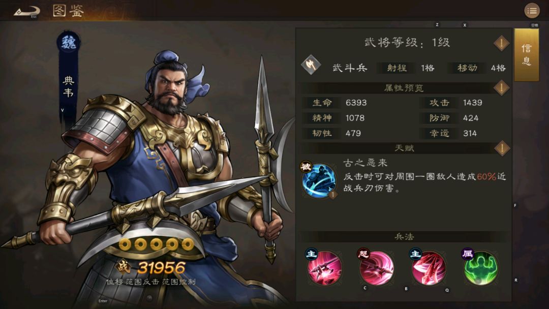 天赋:古之恶来 反击时可对周围一圈敌人造成60%近战兵刃伤害(注意,这个只有反击才有)