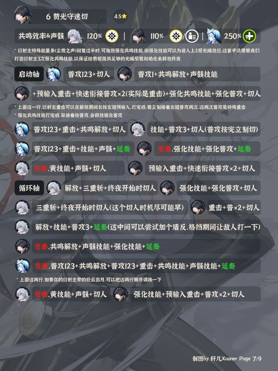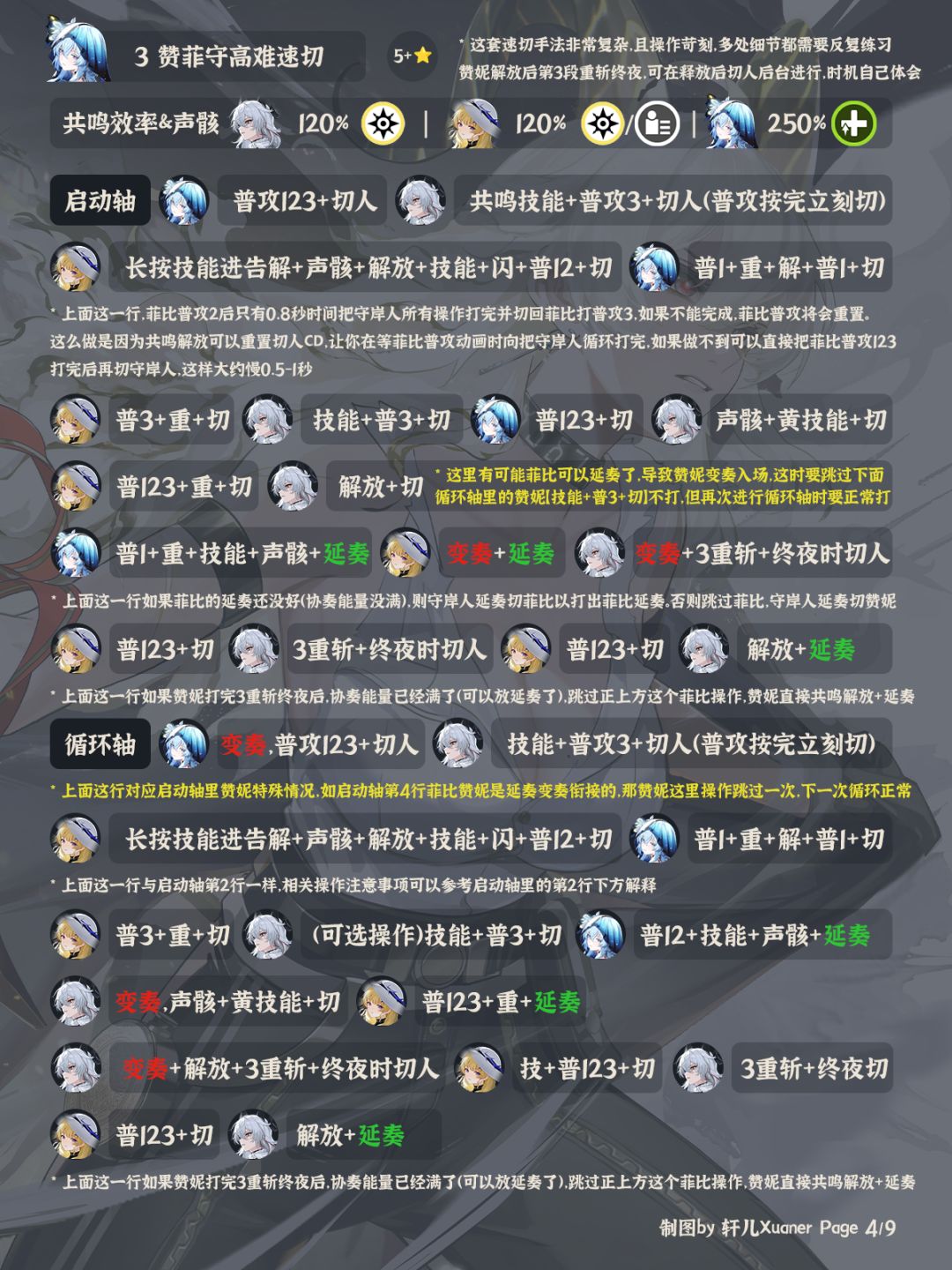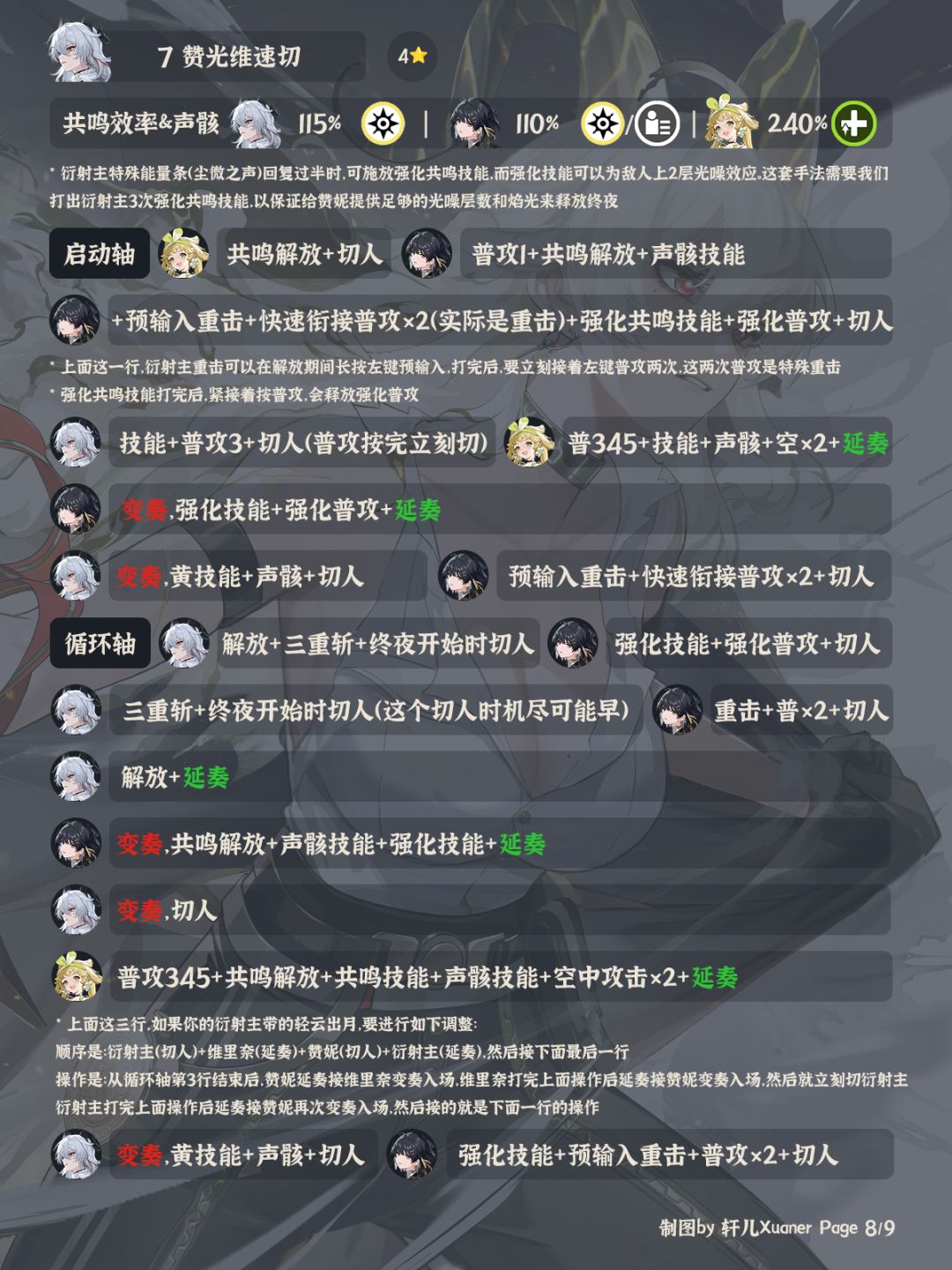 ⑧ 赞妮的核心在于能打出几套重斩也就是关键的第三段终夜,一般在较短的循环轴内只能打出两套,打出三套需要6链赞妮,或者是操作手法好的赞菲光