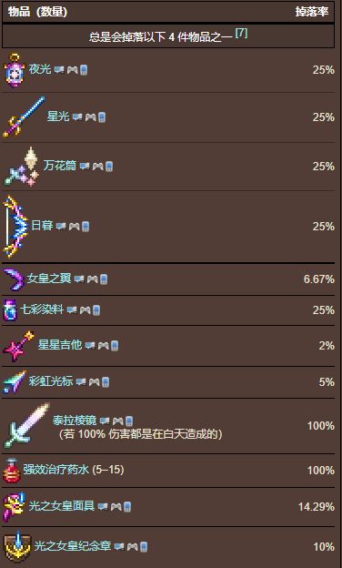 如果玩家对光之女皇的所有伤害都是在白天造成的,她在被击败时会掉落泰拉棱镜。