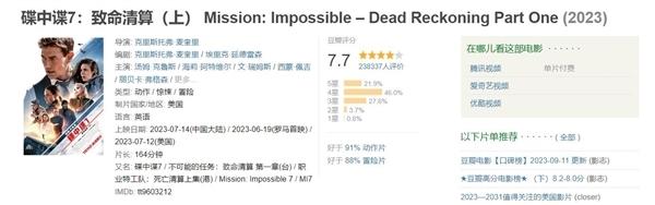 目前《碟中谍8:最终清算》在豆瓣获得了7.7分,成为2025好莱坞引进片评分冠军。