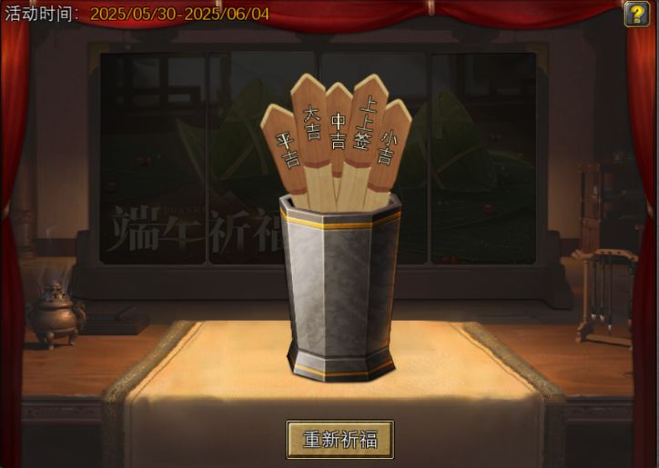 端午祈福活动,看大家手气抽签,不同的标签拥有不同的属性加成。如下下图:当然了有不喜欢的属性加成,那些有实力的大佬们可以花元宝重新抽取,哈哈哈哈哈!!!!