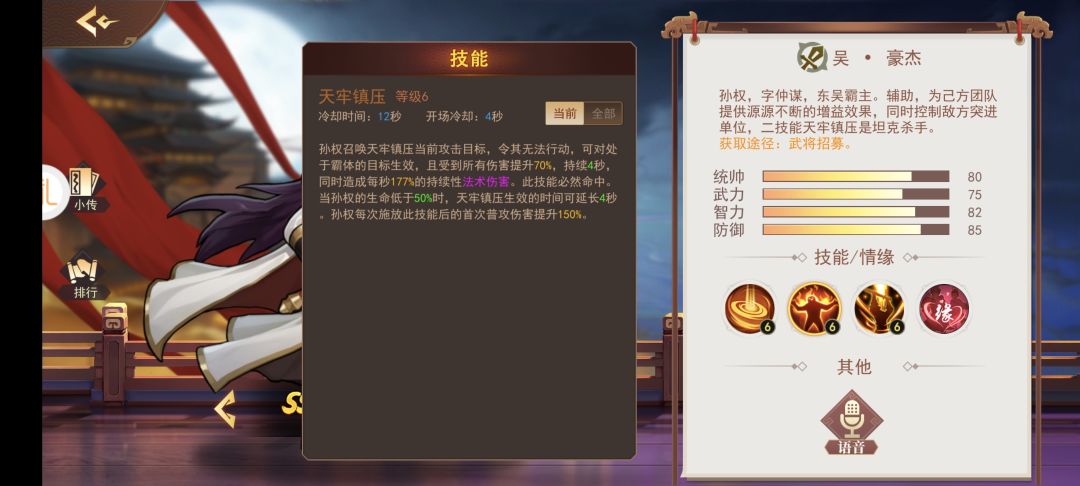 建议玩家积极参加每天12:30-13:30和18:30-19:30的名将讨伐,这是获得元宝的重要渠道,如果获得最后一击和伤害最高,每天最多可获得560元宝加一个金君子,做为名将讨伐活动主力武将,孙权是当之无愧的“不二神将”,笔者带着大家一起看看孙权的技能特点: