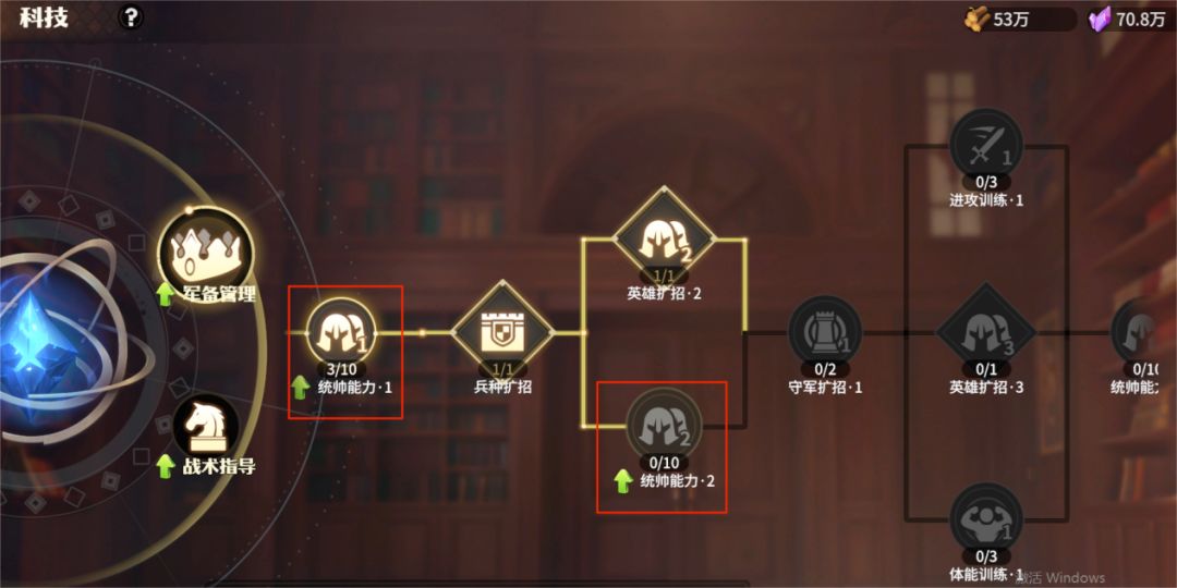 科技分为两条路线,即军备管理和战术指导,优先点军备管理,军备管理有队伍扩容以及英雄攻击+生命的提升,前期开荒提升更大,第一天开荒优先点统帅能力1+2,这样前面2队主力能更强,打黑翼能更高