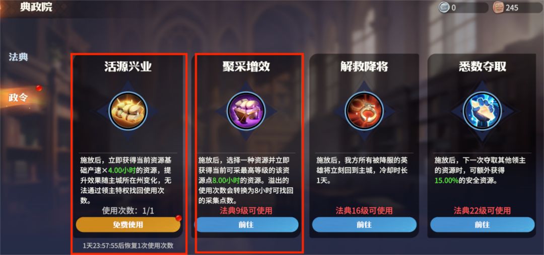 内政官中的典政院可颁布政令获得资源,里面包括铜矿,前期主要的政令点数还是给活源兴业以及聚采增效