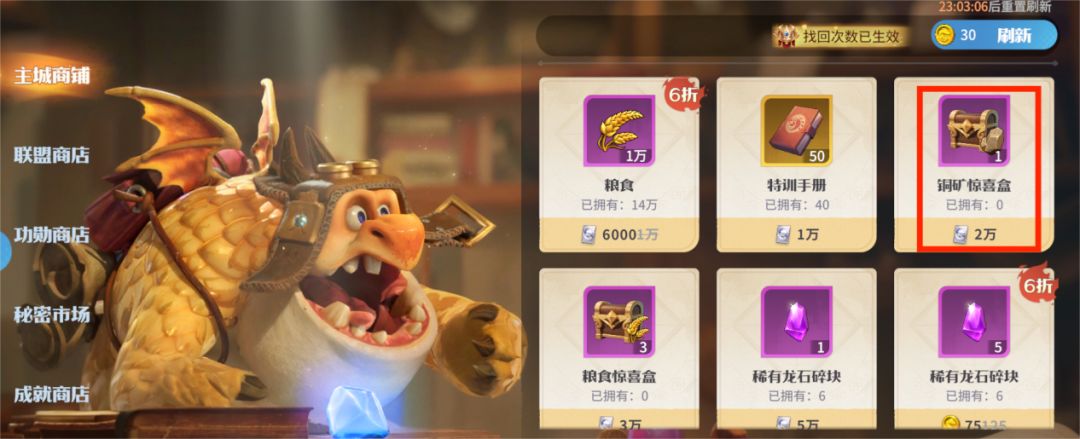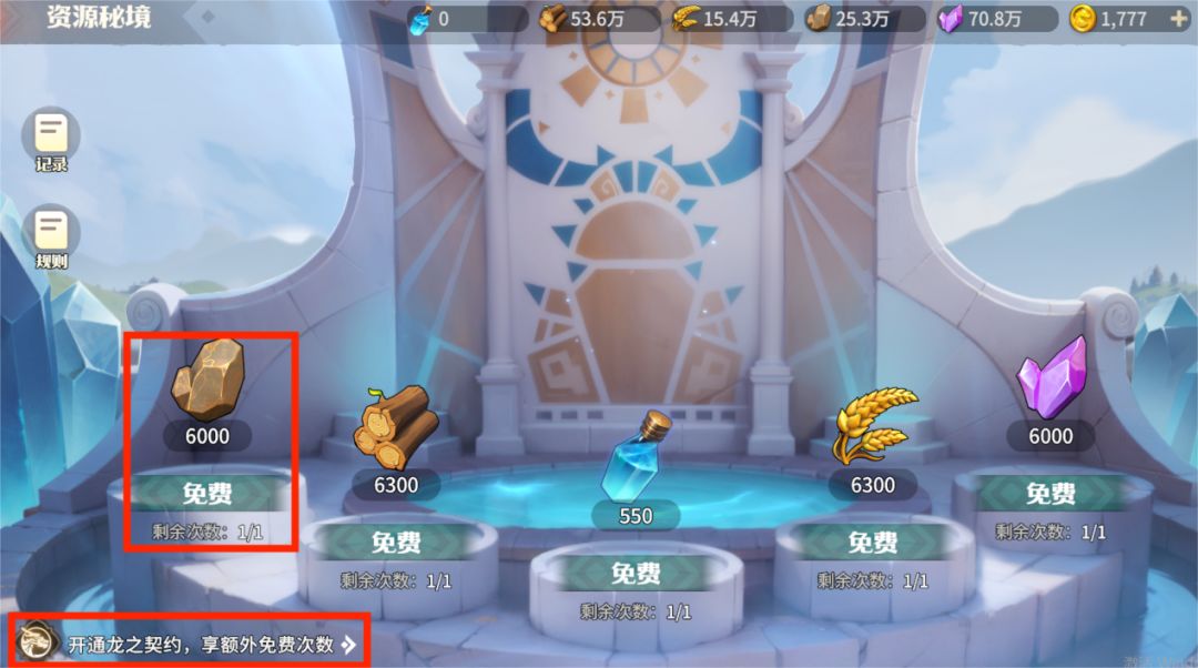 每日免费1次铜矿资源(开通龙之契约2次),后续需要花金币购买次数,平民建议拿3-5次,氪佬建议前期开荒拉满次数
